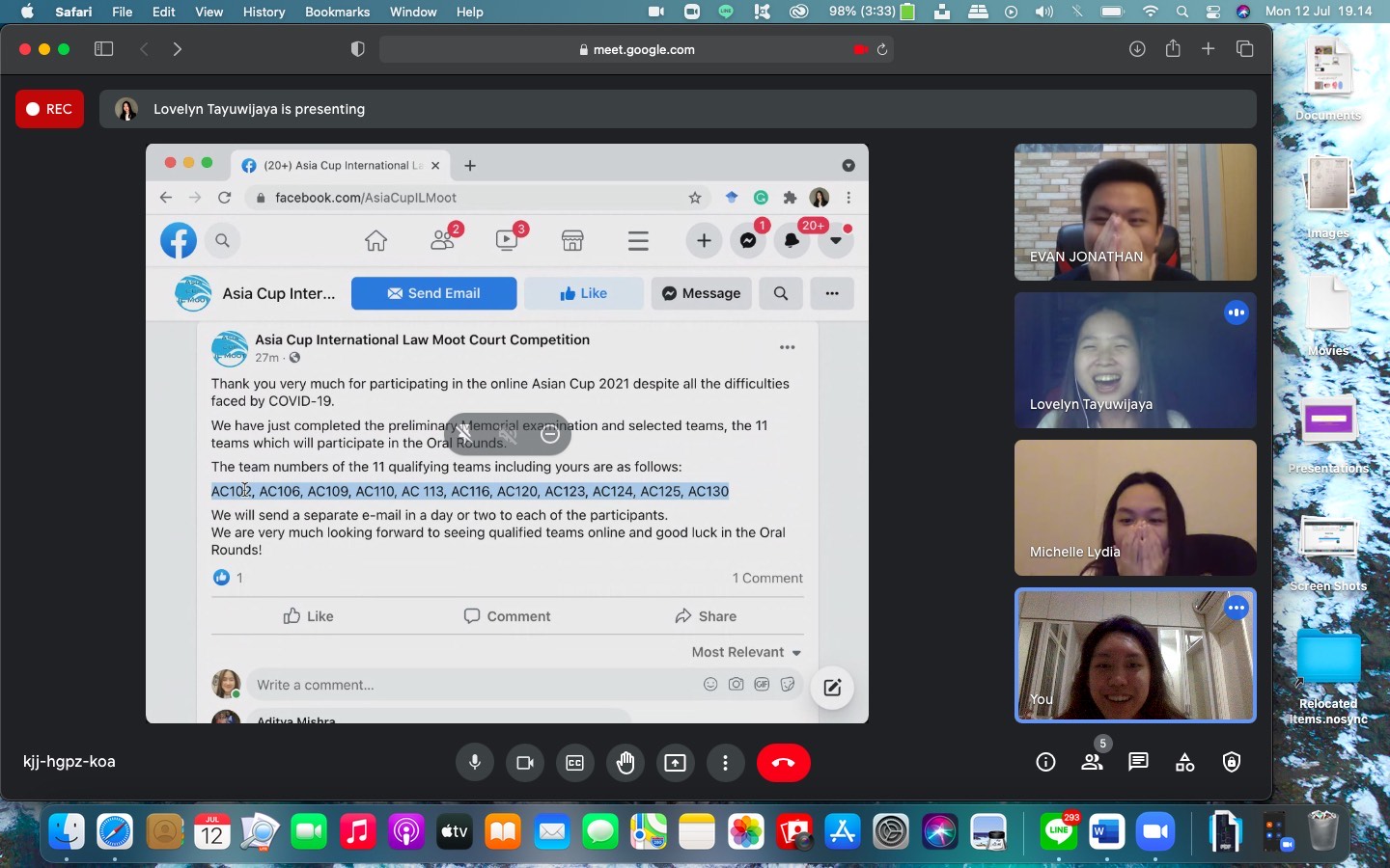 Time went by and we were relieved that the preliminary round had finished. Surprisingly, our journey continued as we advanced to the semi-finals. After the semi-finals were completed, another surprising announcement came to us on 17 August 2021, right on Indonesia’s independence day, that we were finalists in the 2021 Asia Cup ILMCC. Those were very unexpected and incredible blessings. We remain incredibly honoured to finish as the first runner up against Singapore Management University, who were very worthy opponents, having won as Asia Cup champions repeatedly in the last decade alone.